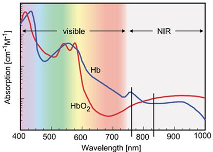 圖 1-3 氧合血紅蛋白和脫氧血紅蛋白對(duì)不同波長光的吸收率