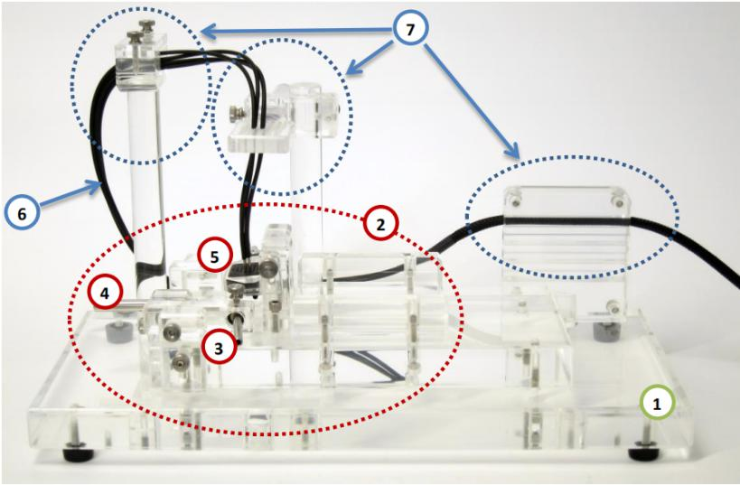 圖4 小動物成像平臺組件 (①塑料底座②動物床③耳棒④咬桿⑤探頭網(wǎng)格⑥光纖線束⑦光纖收納器和固定器)