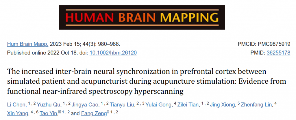 基于以上信息,2022年10月,成都中醫藥大學針灸推拿學院曾芳團隊發表文章,使用功能性近紅外光譜(fNIRS)超掃描(Hyperscanning)技術研究針灸期間針灸師與患者間的腦神經功能同步效應(INS),此項研究The increased inter‐brain neural synchronization in prefrontal cortex between simulated patient and acupuncturist during acupuncture stimulation: Evidence from functional near‐infrared spectroscopy hyperscanning發表在Hum Brain Mapp(IF:5.399)雜志。