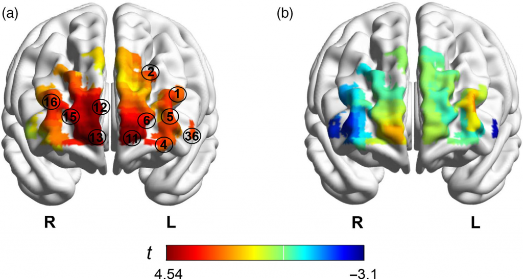圖3 兩組被試與針灸相關的腦神經功能同步效應(INS)t值圖,a.實驗組(VAG),b.對照組(SAG)