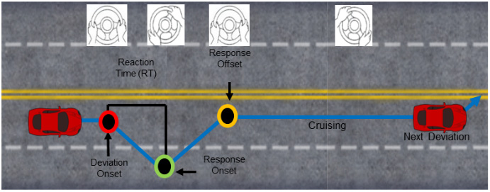 利用三維圖形庫WorldToolKit (WTK)軟件構(gòu)建虛擬現(xiàn)實場景。駕駛場景是在顯示器上呈現(xiàn)一條無盡頭的四車道公路。該程序模擬了夜間在高速公路上以100公里/小時的速度駕駛汽車。該仿真程序可使車輛以相同的概率從巡航車道向左或向右漂移。路上沒有其他車輛,也沒有任何可能影響司機注意力的刺激。任務(wù)時長為60分鐘。實驗開始后,每個被試都要連續(xù)完成一個小時的車道保持任務(wù)。漂移事件(drifting events)是隨機觸發(fā)的,被試必須通過轉(zhuǎn)動羅技公司的賽車輪將汽車移回巡航車道。下一次車道偏離會在車輛回到巡航車道后的16 - 20秒內(nèi)隨機出現(xiàn)。車道偏離有三個時間點,包括偏離開始時間、反應(yīng)開始時間和反應(yīng)結(jié)束時間,如圖1所示。偏離開始是程序觸發(fā)汽車漂移的時刻。反應(yīng)開始和反應(yīng)結(jié)束分別表示被試在偏離任務(wù)后開始和停止轉(zhuǎn)動方向盤使汽車移回巡航車道的時刻偏離開始和反應(yīng)開始之間的時間間隔為反應(yīng)時RT。從偏離開始前的2秒和偏離開始后的15秒定義為一個epoch。以刺激前2秒為基線(緊張性tonic),偏離發(fā)生后15秒為事件相關(guān)腦動力學(xué)變化(時相性phasic)。