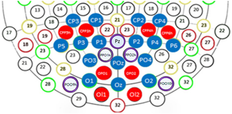 圖2:EEG電極和fNIRS通道放置在標(biāo)準(zhǔn)的fNIRS測量帽上。位置符合國際10-20系統(tǒng)。紅色圓圈是近紅外光源,藍色圓圈是探測器。紫色的圓圈代表頂葉和枕葉區(qū)域的腦電電極。