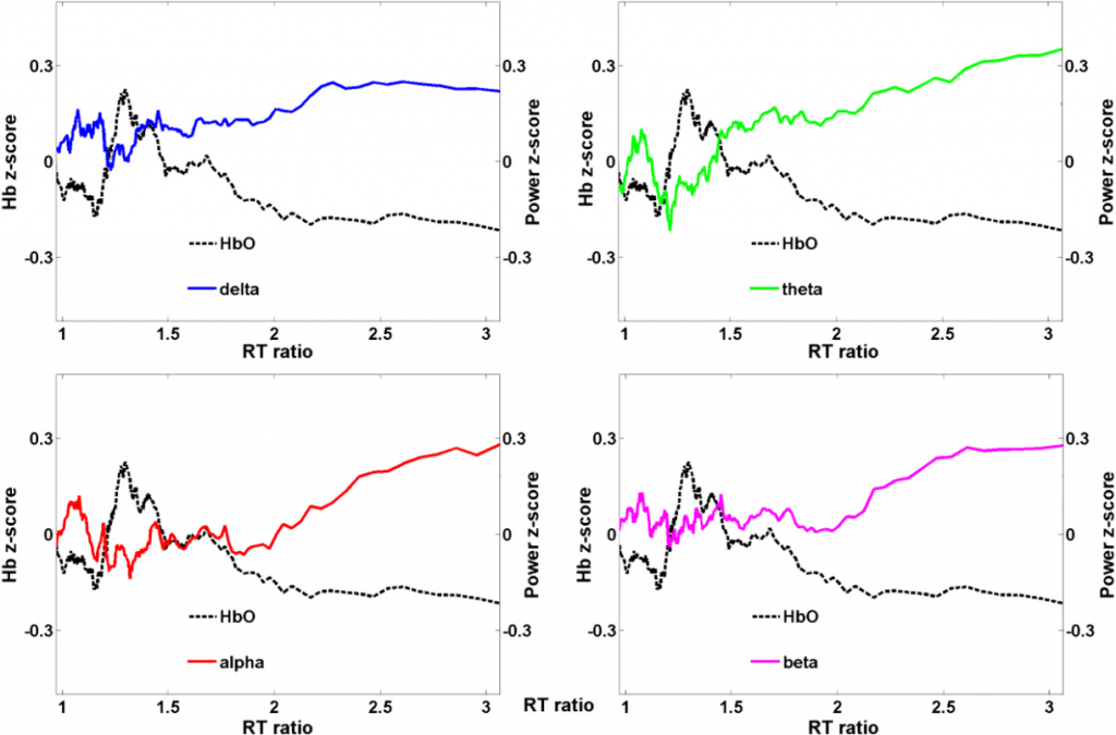 圖7顯示了三組被試的血流動力學(xué)反應(yīng)和θ、α頻帶腦電功率的關(guān)系。偏離任務(wù)開始后,首先出現(xiàn)腦電神經(jīng)激活,隨后出現(xiàn)HbO2水平變化。這一血流動力學(xué)反應(yīng)與對事件反應(yīng)的神經(jīng)元活動有關(guān)。隨著RT-ratio的增加,θ和α的活動明顯減少,尤其是在表現(xiàn)不佳的組。