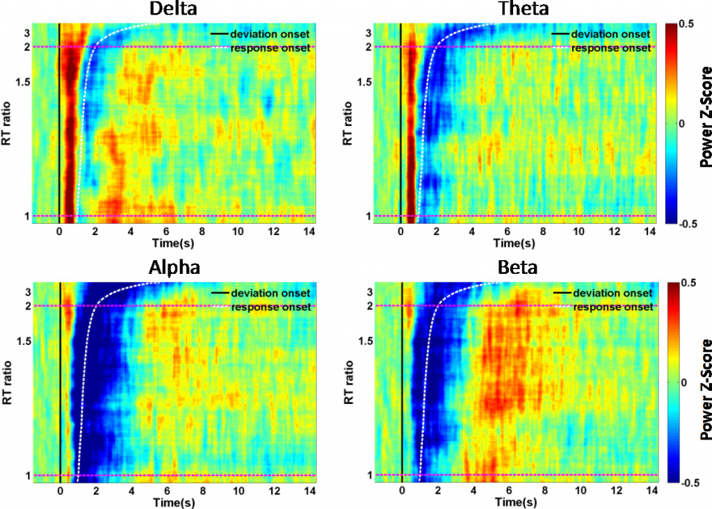 四個腦電頻段的相位功率變化如圖5所示。時相性(phasic)分析能夠觀察到隨著RT-ratio的增加,大腦動力學(xué)的變化:δ波段和θ波段功率在車道偏離任務(wù)開始后立即顯著增加。在偏離任務(wù)開始后,到做出反應(yīng)前,α和β波段功率降低,隨后其活動增加。