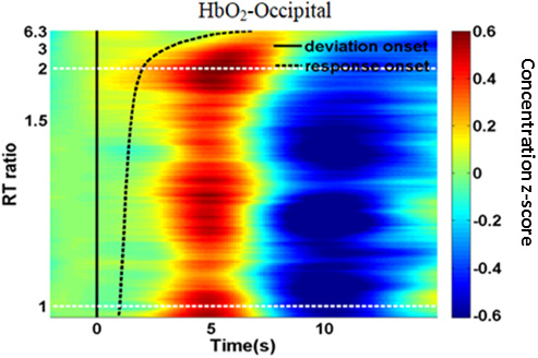相對于RT-ratio,枕區(qū)的時相性HbO2反應(yīng)如圖6所示。HbO2濃度Z分?jǐn)?shù)在偏離任務(wù)開始后的8秒呈正值,在8 ~ 15秒呈負值,之后開始恢復(fù)正常(恢復(fù)期)。隨著RT-ratio的增加,偏離任務(wù)開始后枕區(qū)HbO2正值略有下降。此外,我們注意到恢復(fù)期的HbO2的Z分?jǐn)?shù)隨著RT-ratio的增長而降低。