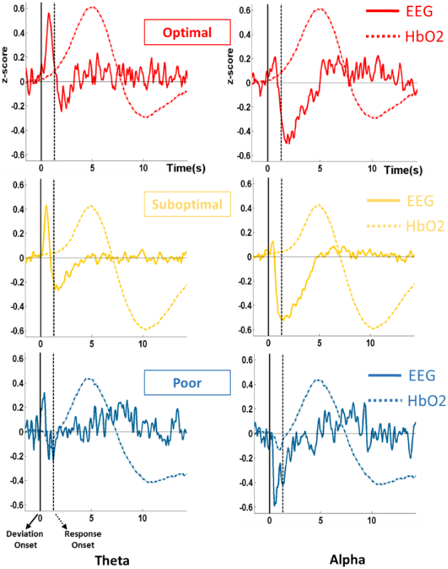 圖7:偏離任務(wù)開始后三組被試(最佳、次優(yōu)和較差)的腦電功率和HbO2濃度水平的變化對比