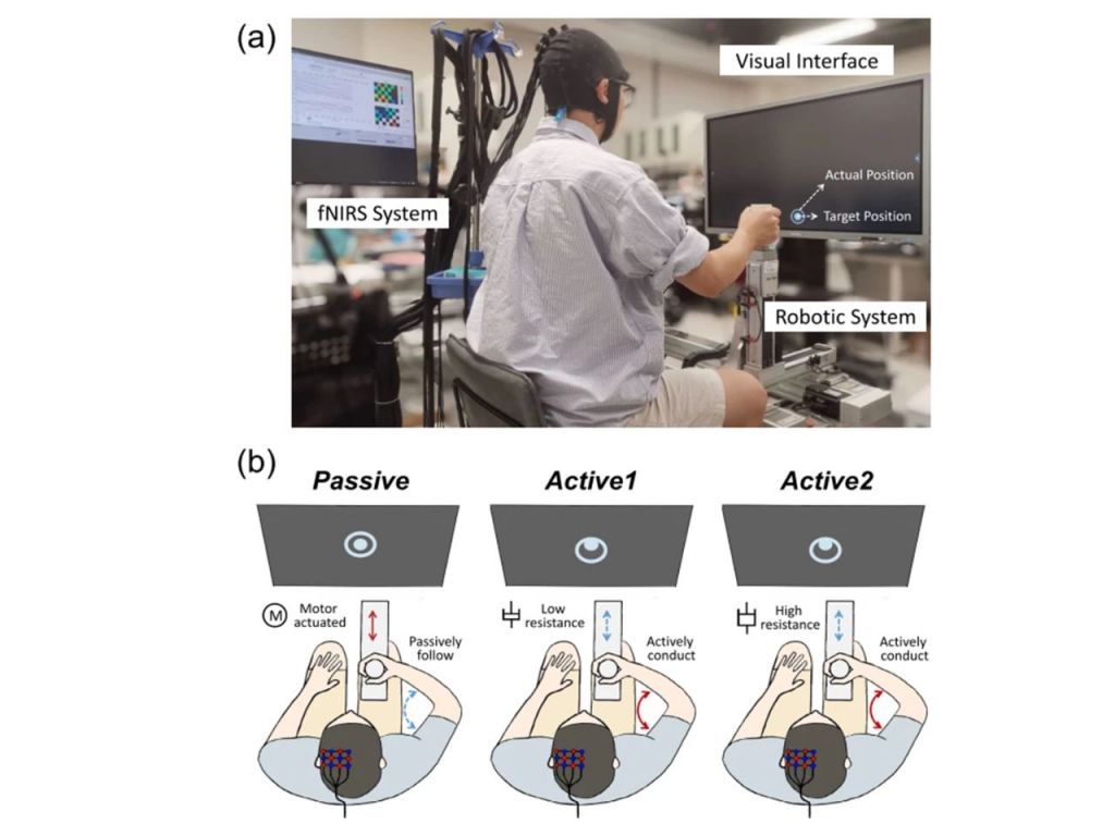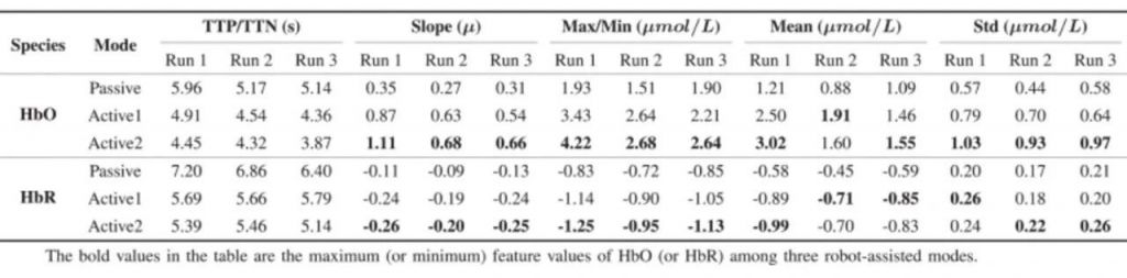 研究人員招募了10名健康成年人,均為右利手。研究中采用了波長為785nm和830nm的近紅外設備來檢測大腦血氧的變化情況,采樣率為10.4HZ,通道覆蓋左半球的前運動皮層、輔助運動區和初級運動皮層。在實驗過程中,參與者被要求在以下三種機器人輔助模式下進行右肘伸展-屈曲運動: