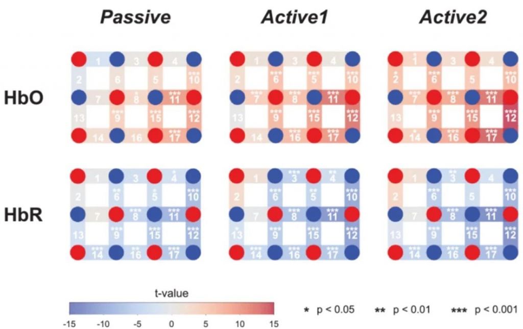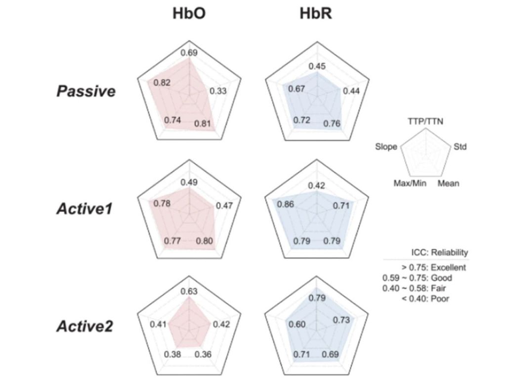 其次,通過計算以下5個常用時間特征的類內相關系數(ICC),以量化HRF在3次運行中的時間可靠性。TTP/TTN:HbO(或HbR)達到峰值(或最低點)的時間;斜率:線性最小二乘法擬合 HRF 的斜率介于0到4s之間;最大/最小值:2到8秒之間的最大(或最小)HbO(或 HbR)振幅;平均值:2到8秒之間的平均振幅;標準差:2到8秒之間的振幅標準差。結果表明:在被動模式下,ICC值對HbO和HbR的斜率、最大值/最小值和平均值均表現出良好到極好的可靠性;在主動模式1下,斜率、最大/最小值和平均值表現出出色的可靠性。