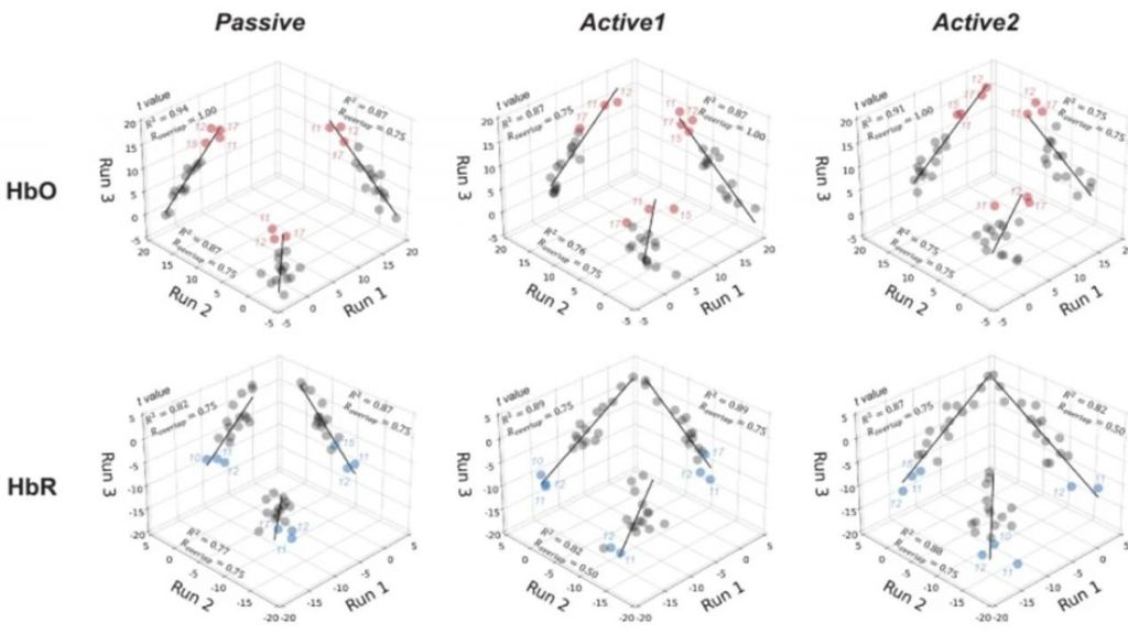 為了對可靠性進行全面的研究,研究人員關注兩個不同的方面。首先,利用線性混合效應模型來估計組級的t值,并采用與受試者級別激活模式類似的方法來構建組級激活模式。通過估計的激活模式,計算決定系數和空間重疊程度兩個指標,評估了受試者和組水平的空間可靠性。結果表明,與被動運動相比,主動運動引發了更強的激活;HbO的簇類空間可靠性優異,HbR的可靠性一般到良好。