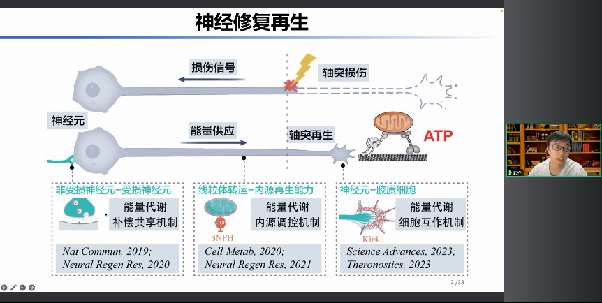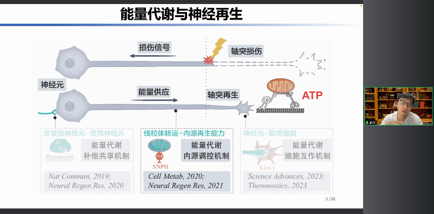 這些都是過去已經(jīng)發(fā)表的文章,我就不過多贅述。我想舉一個例子,在神經(jīng)的修復(fù)再生過程中,能量它是怎么通過一個內(nèi)源調(diào)控機制來促進神經(jīng)的軸突再生的。
