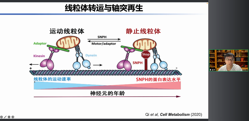 我們通過一系列遺傳學(xué)的篩選,最后發(fā)現(xiàn)了SNPH這個蛋白,它是一個可以把線粒體鉚定在微管上的鉚釘?shù)鞍祝覀儼阉Q之為線粒體的鉚釘?shù)鞍住_@個蛋白非常有意思,隨著神經(jīng)元年齡的增長,它的表達量是逐漸增加的,這解釋了為什么線粒體的轉(zhuǎn)移運動速率會隨著年齡增大逐漸降低。