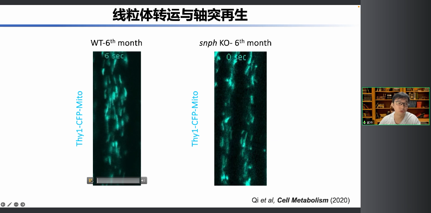 我們以一個六個月的小鼠為例,你可以看到神經(jīng)元軸突里面有很多線粒體,其中70-80%都處于一個靜止的狀態(tài),只有20-30%處于運動的狀態(tài)。當(dāng)我們把線粒體的鉚釘?shù)鞍捉o它敲除了之后,它可以極大的加速線粒體在軸突中的轉(zhuǎn)運。