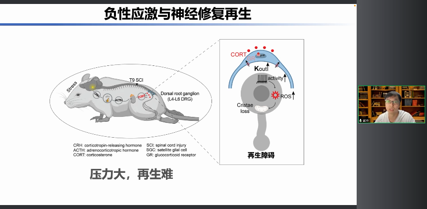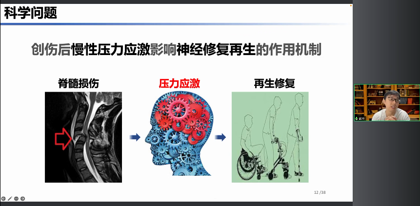 神經(jīng)損傷會對我們的運動感覺以及內(nèi)臟器官的生理功能造成巨大的沖擊,從而導(dǎo)致機體持續(xù)處于一種高壓力或者高應(yīng)激的狀態(tài)。這種持續(xù)的高壓力高應(yīng)激所帶來的負性情緒是不是會影響我們神經(jīng)的修復(fù)和再生呢? 那么接下來我就想向大家匯報一下,我們在負性應(yīng)激與神經(jīng)修復(fù)再生中的相關(guān)工作。