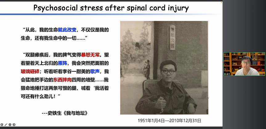 當(dāng)我們個體無法適應(yīng)這些壓力時,就會產(chǎn)生焦慮或者抑郁這些負性情緒。史鐵生,非常著名的作家,他也是一位脊椎損傷的患者,在脊椎損傷之后,他的情緒就發(fā)生了劇烈的變化。 比如說在《我與地壇》一文中他就描述到,“我的生命就此改變了”, “脾氣變得暴躁無常”等等。