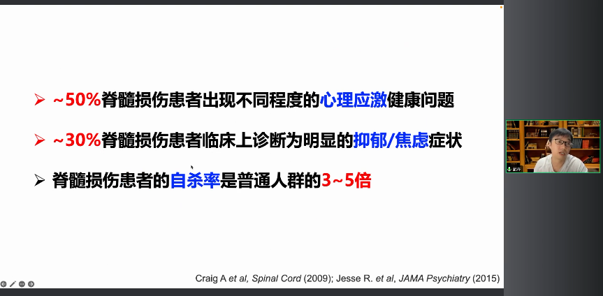 在臨床上,那么50%的神經(jīng)脊柱損傷患者都會出現(xiàn)不同程度的心理應(yīng)激問題,30%的患者可以診斷出明顯的焦慮或者抑郁狀態(tài),而且脊柱損傷患者的自殺率也是普通人群的3-5倍。