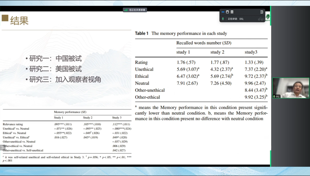 我們總共做了三個研究,分別是選取的中國被試,美國被試以及加入觀察者視角。基于實驗結果我們進行了迷你云分析,得到的結論是非道德行為和道德行為均會損害對后續材料的記憶,但前者的影響會更大。
