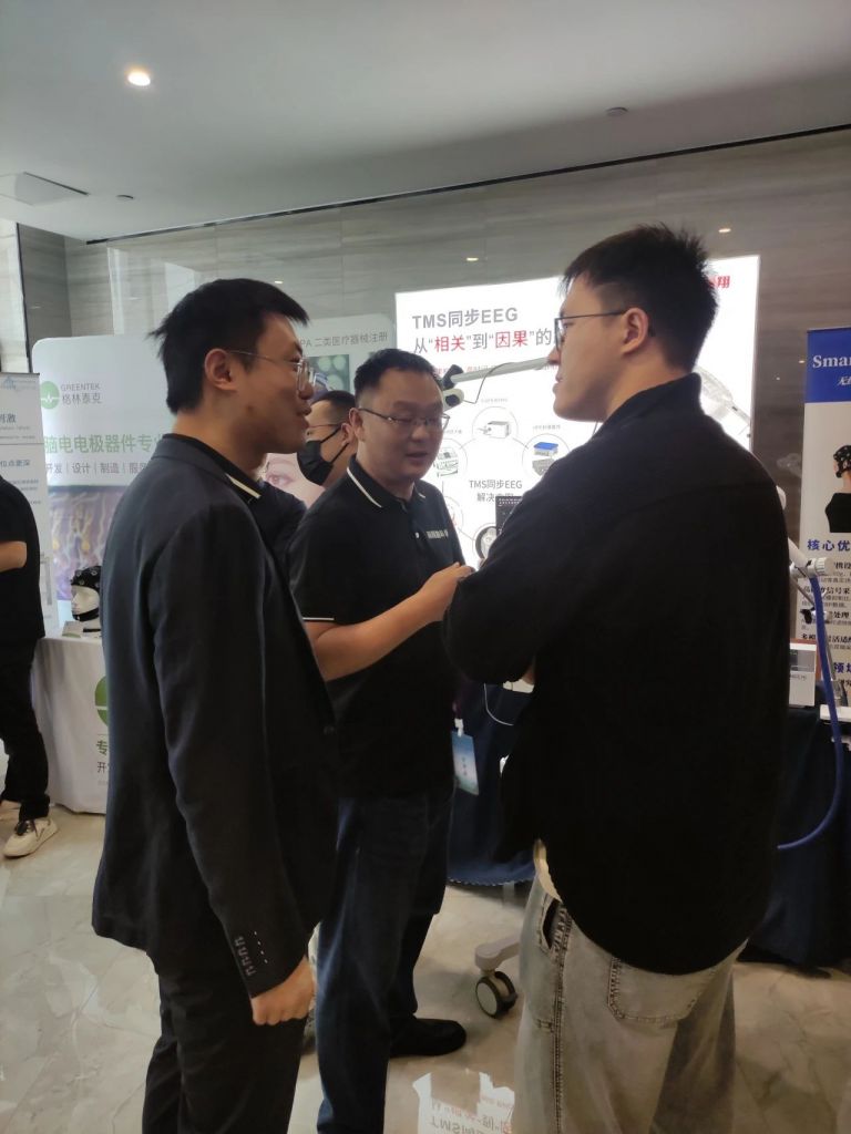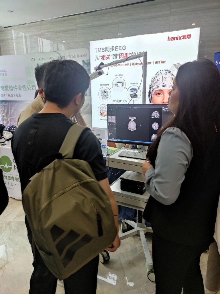 瀚翔腦科學作為此次會議贊助單位,攜自主研發的經顱磁刺激儀、TMS導航系統、經顱電刺激儀和便攜式BrainProducts actichamp plus 腦電、可穿戴鹽水腦電X.ON參加此次會議,眾多學者、老師和學生前來參觀、互動、交流。