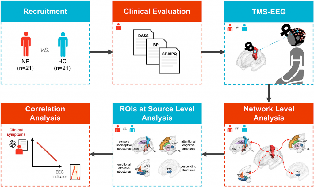 神經(jīng)病理性疼痛(NP)是一種典型的難治性慢性疼痛,全球約有10%的人群深受其擾。近年來(lái),非侵入性腦刺激(NIBS)技術(shù)在神經(jīng)病理性疼痛方面展現(xiàn)出了巨大潛力。其中,重復(fù)經(jīng)顱磁刺激(rTMS)和經(jīng)顱直流電刺激(tDCS)等技術(shù)備受關(guān)注。然而,關(guān)于rTMS鎮(zhèn)痛作用在神經(jīng)病理性疼痛中的神經(jīng)回路基礎(chǔ),目前仍不明確。為了深入探究這一問題,研究采用了單脈沖經(jīng)顱磁刺激(TMS)結(jié)合腦電圖(EEG)評(píng)估大腦皮層的不同連接性。通過TMS-EEG,研究者能夠?qū)﹃P(guān)鍵通路的電流傳播進(jìn)行表征,包括下行通路、注意力認(rèn)知疼痛通路以及情感疼痛通路。研究中還引入了兩個(gè)重要的指標(biāo):顯著電流密度(SCD)和顯著電流傳播(SCS)。顯著電流密度是對(duì)TMS誘發(fā)EEG活動(dòng)的局部源電流密度的度量,而顯著電流傳播則是從TMS靶點(diǎn)(M1)到特定腦區(qū)電流擴(kuò)散的累積距離。