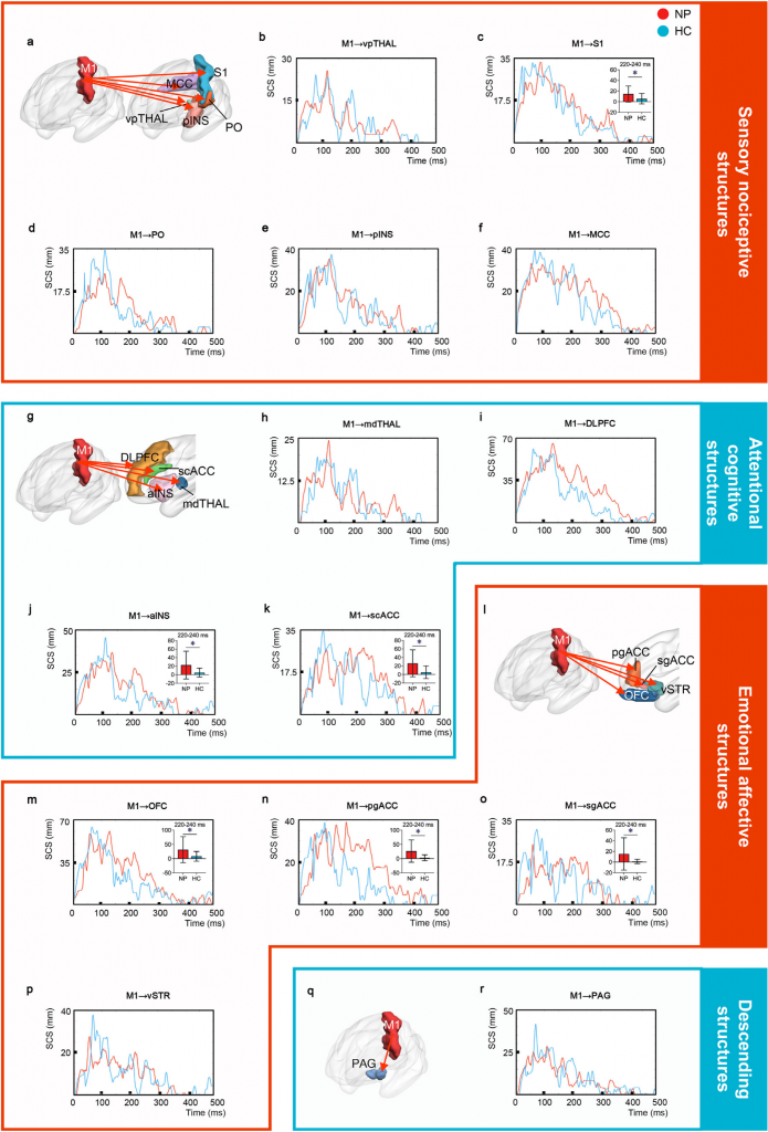 與健康對(duì)照組相比,神經(jīng)病理性疼痛患者在感覺痛覺結(jié)構(gòu)中表現(xiàn)出顯著的電流傳播異常。M1至初級(jí)體覺皮質(zhì)(S1)的電流傳播顯著增強(qiáng),這一異常傳播主要集中在220 - 240ms的時(shí)間窗內(nèi)。表明在神經(jīng)病理性疼痛狀態(tài)下,運(yùn)動(dòng)皮層對(duì)感覺痛覺相關(guān)腦區(qū)的激活模式發(fā)生了改變,可能與疼痛感知的異常增強(qiáng)有關(guān)。