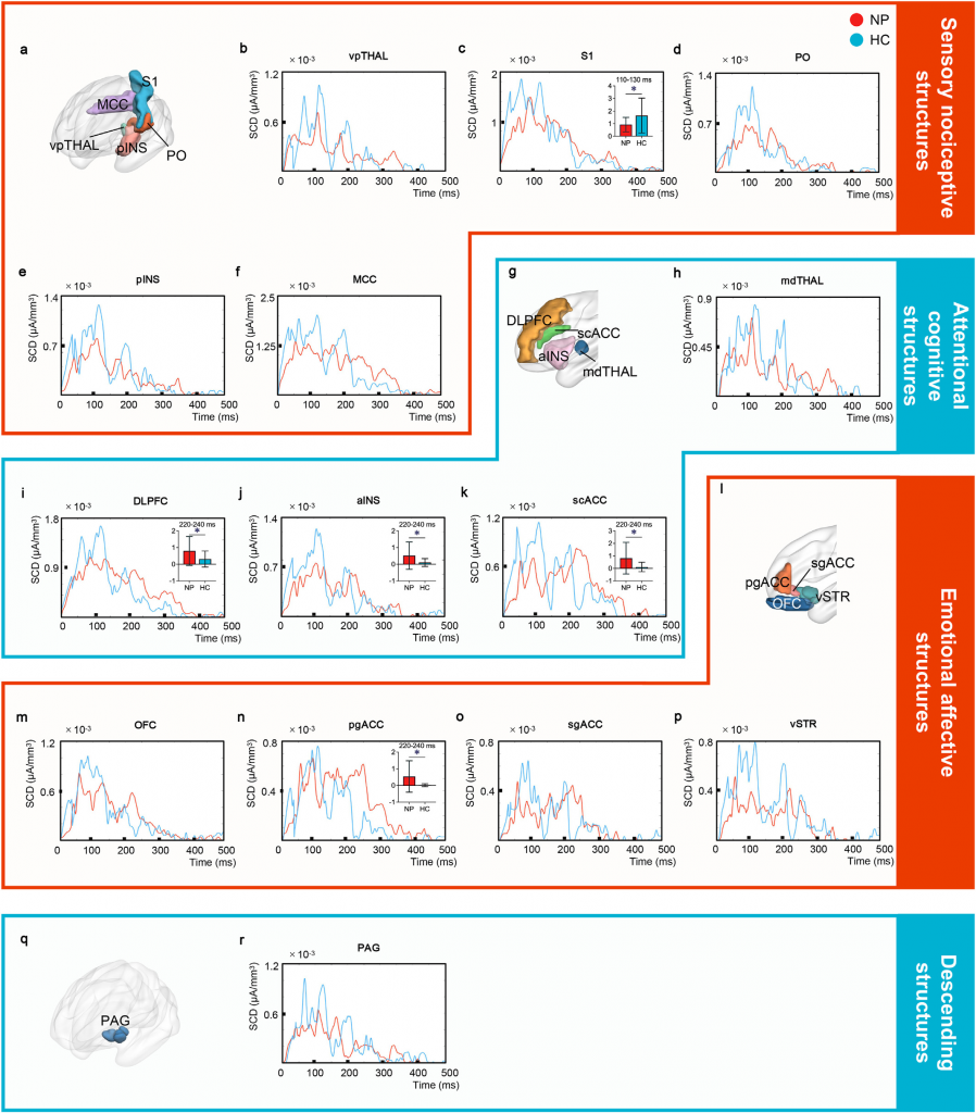 在情感疼痛結(jié)構(gòu)中,神經(jīng)病理性疼痛患者前扣帶回皮層(pgACC)的局部電流密度顯著高于健康對(duì)照組,異常同樣出現(xiàn)在220 - 240ms的時(shí)間窗口。這一結(jié)果進(jìn)一步強(qiáng)調(diào)了情感疼痛相關(guān)腦區(qū)在神經(jīng)病理性疼痛中的異常激活,可能與患者疼痛體驗(yàn)中的情感成分加劇有關(guān),如焦慮、抑郁等負(fù)面情緒的加重。