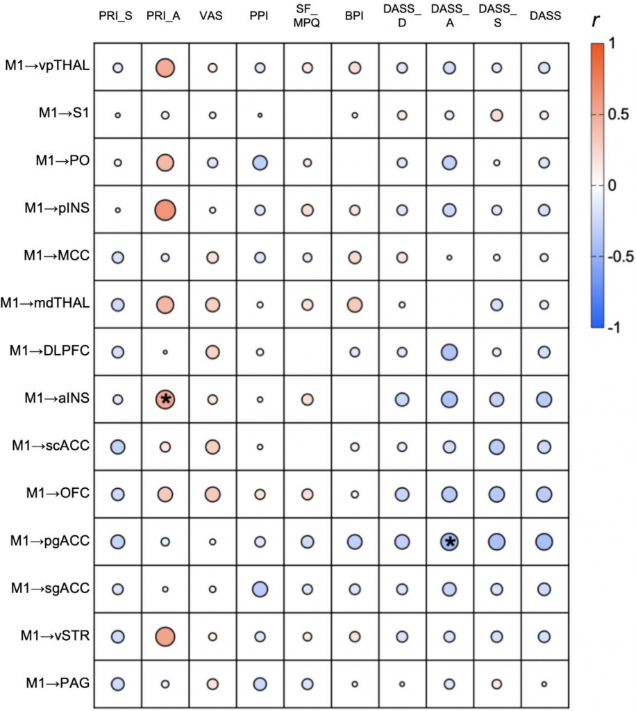 通過皮爾遜相關(guān)性分析發(fā)現(xiàn)M1至前島葉(aINS)的電流傳播強(qiáng)度與情感疼痛體驗(yàn)量表之間存在顯著的正相關(guān)關(guān)系。這意味著電流傳播的增強(qiáng)與患者情感疼痛體驗(yàn)的加重密切相關(guān),提示了前島葉在神經(jīng)病理性疼痛情感成分中的重要作用。