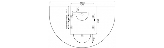 受試者需要在禁區外的 P1、P2、P3、P4、P5 位置分別完成 10 次投籃(圖 3),共 50 次。P1 到 P5 和 P2 到P4的直線距離為4.9 m,P3到籃筐距離為4.225 m,籃框距地面高度為3 m,球框直徑大小為45 cm。所有受試者以右手使用同一個標準7號籃球進行投籃。每次測試前在5個位置分別進行3次投籃熱身。
