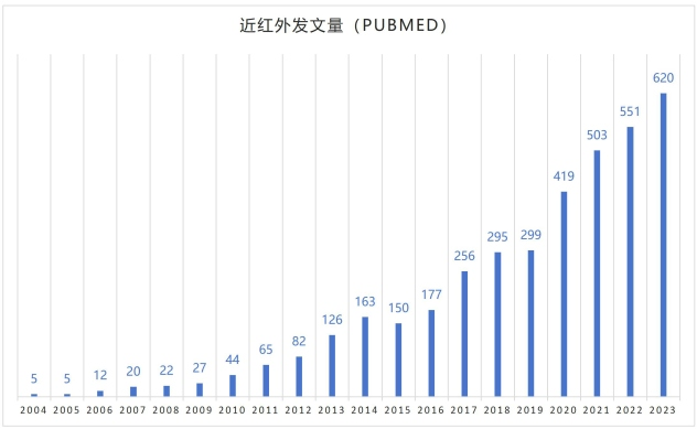 近年來,近紅外腦功能成像(fNIRS)技術因其非侵入性、便攜性以及對腦部活動監測的高靈敏度而備受關注,fNIRS相關的研究論文發表數量逐年增加。特別是在高影響力期刊中,如《NeuroImage》、《Frontiers in Human Neuroscience》和《Journal of Biomedical Optics》,相關文章涵蓋了技術改進、應用拓展以及多模態成像技術的創新等話題。NIRS技術在設備、應用領域及文獻發表上都呈現出穩步上升的趨勢,并逐步成為神經科學研究中的核心工具之一。