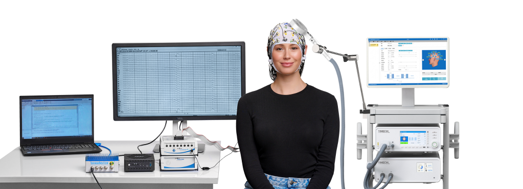本次工作坊由瀚翔腦科學的臨床技術高級工程師翁祺和科研技術高級工程師段翼新分別進行TMS同步EEG實操過程的演示和TMS-EEG數據的分析,展現了英智TMS同步EEG的創新解決方案: