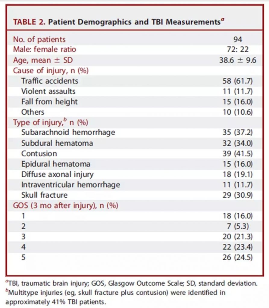 研究期間,共登記了467個僅有腦損傷的患者,其中98人符合入選標準。4名患者在隨訪結果測試中沒聯系到,因此最終入選了94個患者。請見Table2中的人口統計數據。