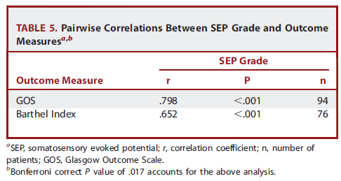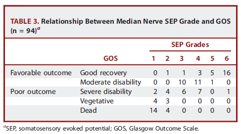 我們的研究證明SEP級別和患有重度創傷性腦損傷1年后的預后之間有顯著相關,尤其是用SEP級別1來預測不良預后(特異性100%),SEP級別6預測良好預后(特異性為97.8%)。然而,當缺少雙側SEPs時,在預測重度TBI患者的不良預后應該更謹慎。SEPs的缺少不能作為撤銷治療的唯一預測因子。對于SEP級別為2-5的患者,可能有多種結果。還需要進一步研究來分析其和患者功能預后之間的關系。
