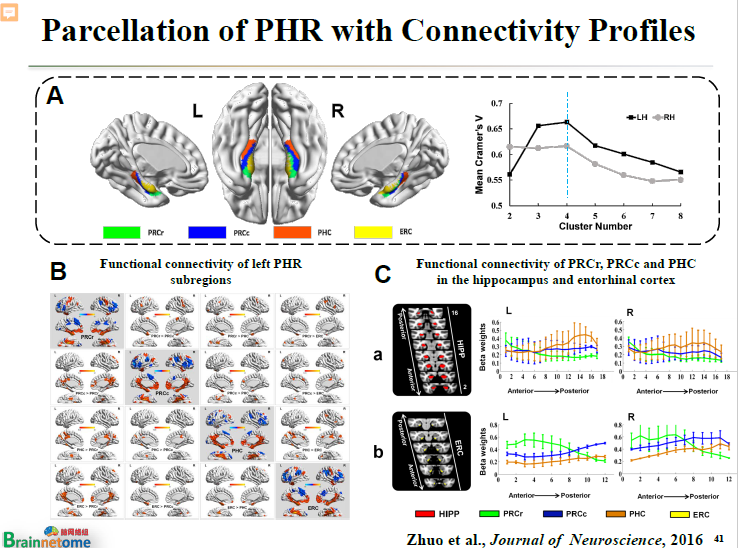 而用腦網絡組圖譜的思想對旁海馬重新分區以后,發現旁海馬不僅有前后兩個分區,而是至少可以分成前、中、后三個分區。