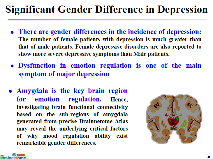 第二,與抑郁癥有關。我們發現男女在調節情緒方面使用的是完全不同的網絡。