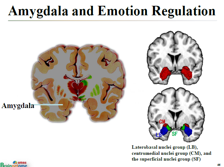 這個問題到現在并沒有非常清晰的答案。但有一些腦區跟情緒調節有關是非常明確的。像Amygdala,即杏仁核腦區,就是跟情緒調節有關的,而且這個結論非常明確。