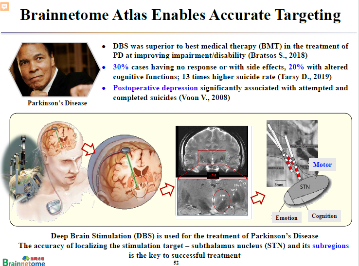 DBS治療的靶點主要在丘腦底核(subthalamus nucleus,STN)。而丘腦底核可以分成三個不同亞區,分別跟運動、情緒、社會認知功能有關。如果電極剛好放在跟運動有關的腦區,那么治療效果可能就很好。