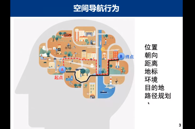 今天給大家主要介紹一下人的兩個功能性功能的特點。首先是導航行為,導航行為是跨物種、具有非常強保守性的,不管是動物覓食還是我們人日常生活中的通勤行為,都涉及到導航行為的規劃。比方說這個圖上展示的從A點到B點有兩條不同的路線,在不熟悉場景的情況下,我們會選擇不一定是最優的路線,但是當我們對環境非常熟悉的情況下,我們會選擇從起點到終點最佳的路線,這條最佳路線不一定是距離最短,但一定是效率最高的。比如高峰期的情況下,我們會選擇避開最短路線,可能會選擇一條稍微長一點但是通行時間比較短的路線。