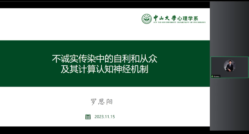 2023年11月15日晚20點,中山大學心理學系副教授、博士生導師羅思陽教授作為腦客中國科研第124位講者為大家帶來主題為《不誠實行為演化中的自利和從眾及其計算神經機制》的報告。