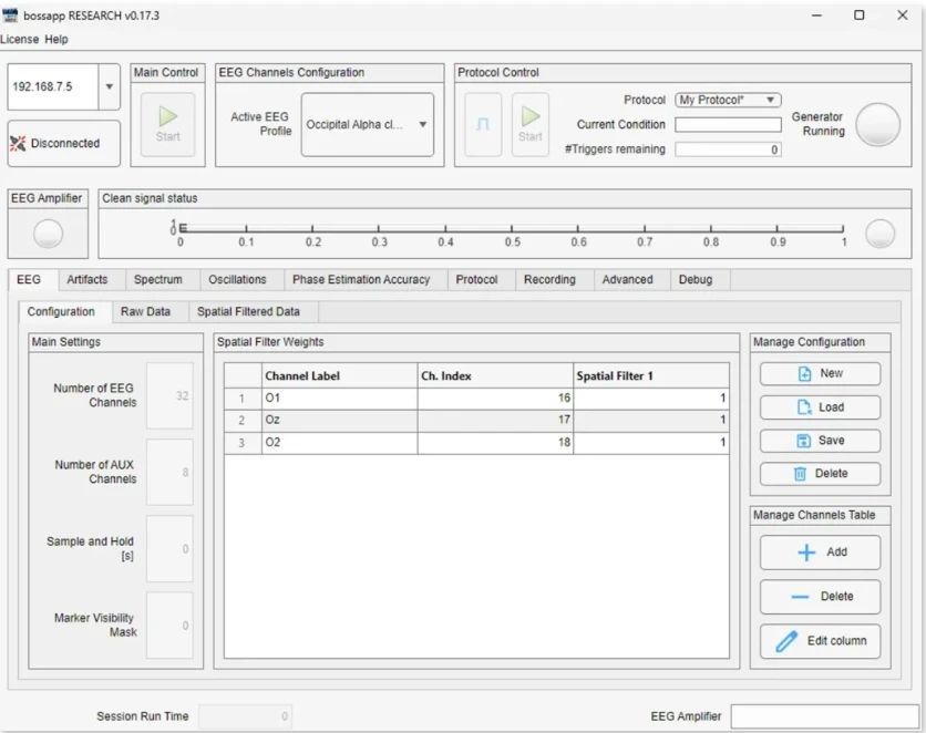 圖1:bossapp RESEARCH 的操作界面。這里展示的空間濾波權重僅為一個來自枕葉 alpha 空間濾波器配置的示例。